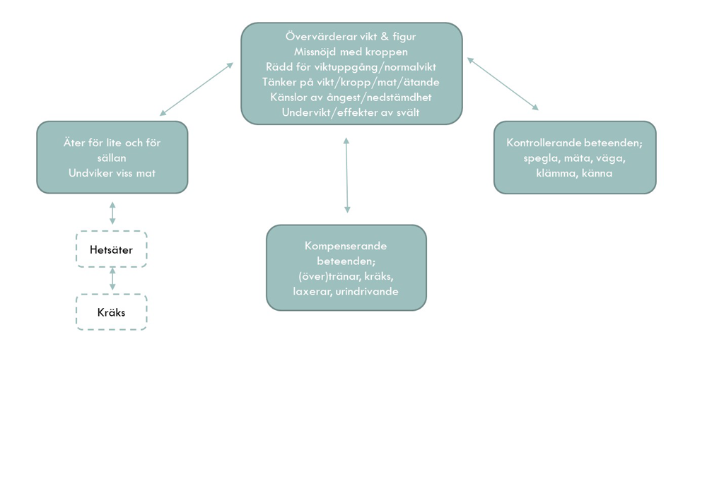 Sociokulturella: Kulturellt, synen på skönhet, hälsa, kontroll. Vanligare i vissa grupper, ex. elitidrott.